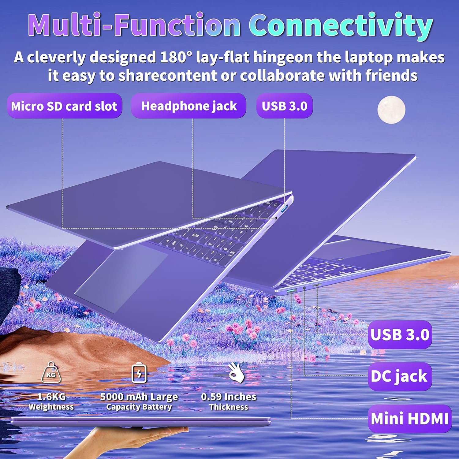 Versatility+Ports+Long Battery Life: Enjoy a 7-color backlit keyboard, fingerprint recognition, and a variety of ports including USB3.0, headphone jack, DC jack, Micro SD, and mini HDMI. The 5000mAh battery ensures extended use, while the laptop’s versatility and connectivity cater to your on-the-go lifestyle.