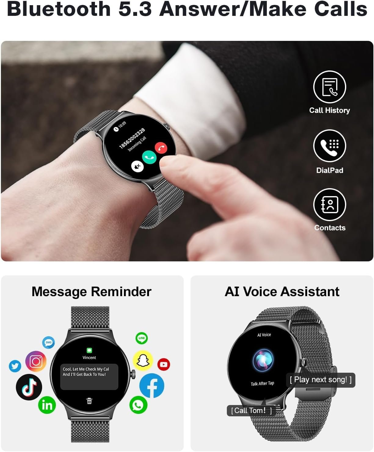 【Bluetooth Calls & Smart Notifications】Stay connected effortlessly with this advanced smartwatch! Featuring Bluetooth 5.3 and a high-quality mic and speaker, it ensures crystal-clear calls directly from your wrist. Get instant notifications of SMS and APP messages with gentle vibration, and read messages directly on the watch (editing and sending not supported). The built-in AI voice assistant simplifies tasks, while wide compatibility with Android 4.0+/iOS 9.0+ makes it perfect for everyone.