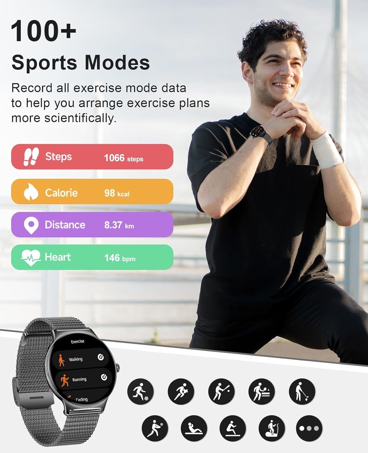 【100+ Sports Modes & IP67 Waterproof】Elevate your fitness with this versatile smartwatch featuring 100+ sports modes, including walking, running, dancing, gym workouts, outdoor adventures, and more. Track key metrics like steps, calories, and heart rate for a complete overview of your performance. Built with IP67 waterproof protection, it withstands rain and sweat, letting you exercise worry-free in any environment. Note: Not suitable for swimming, diving, or prolonged sauna use.