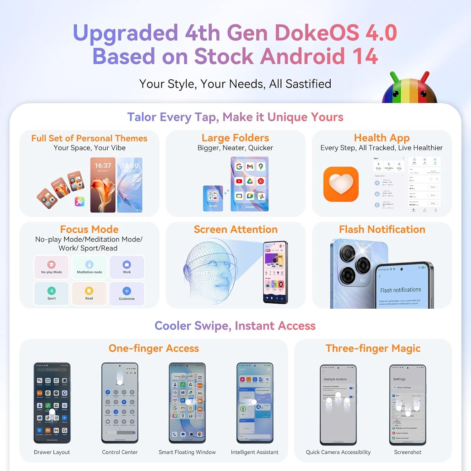 【Latest Android 14 System & Doke OS 4.0】The SHARK 9 android phone is equipped with the latest Android 14 operating system, enhancing privacy and personalization for a seamless work and play experience. And provide more friendly interaction, more beautiful interface, faster speed, lower power consumption, overall performance improvement of 20%. Doke OS 4.0 is developed based on Android 14 and provides users more personalized additional features like call recording and exercise index tracking. instant sharing without network connection, text drag and drop, refined privacy protection,easy multitasking with split screen App, and separate authorization for files.,etc.