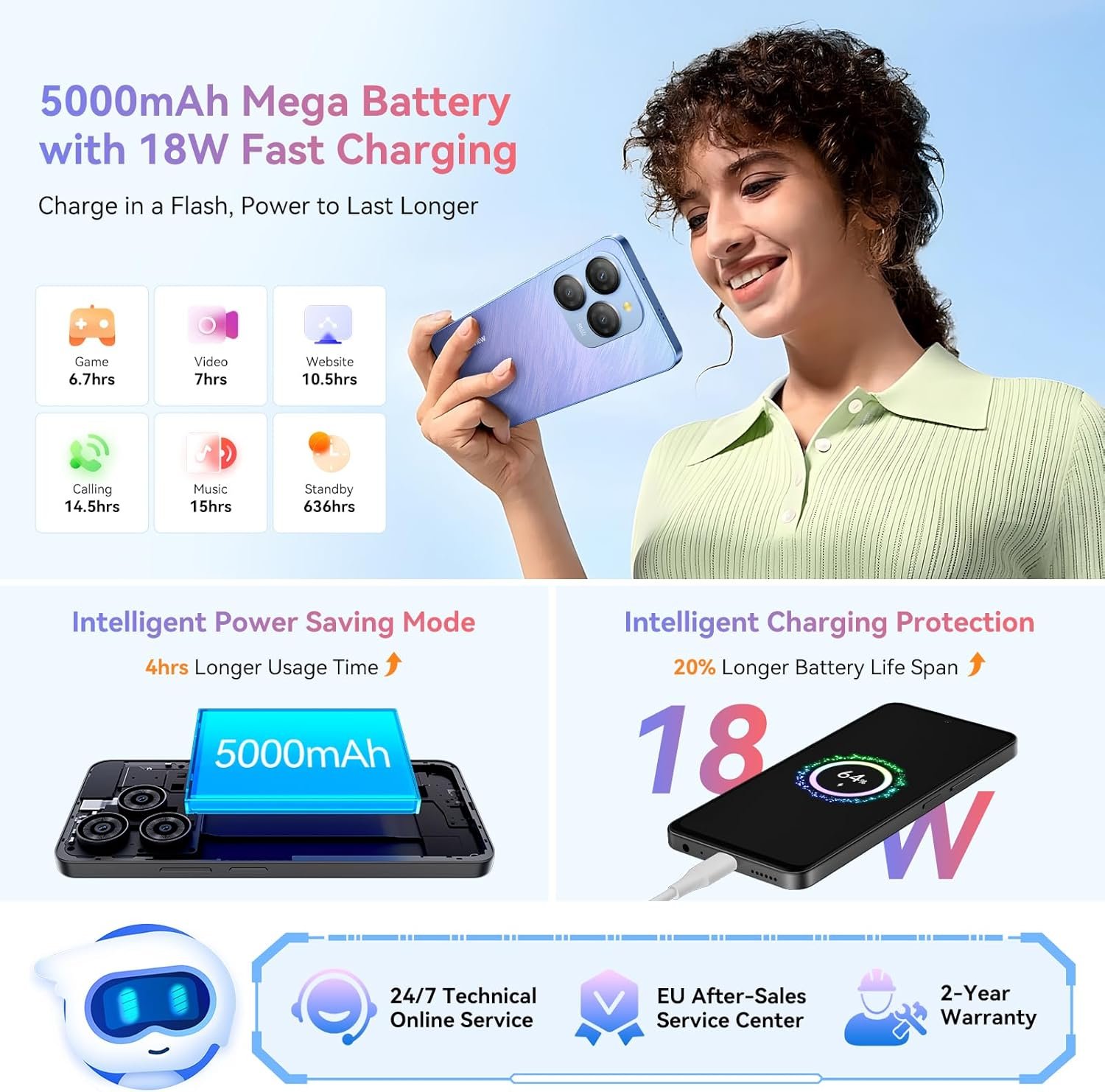 【50MP Main Camera+ 4K Video Record】This Android 14 smartphone comes with an 50MP main camera and a 8MP front camera with facial recognition and beauty mode. It automatically recognizes the brightness in different lighting conditions to take pictures that will make you happy. The phone also comes with 360°panorama mode, night mode, professional mode, and portrait mode for daily use. 4K resolution allows for a much more immersive viewing experience when you playback your videos. The colors are more vivid, and the overall sharpness is enhanced, making it perfect for recording important events, beautiful landscapes, or even action packed sports moments.