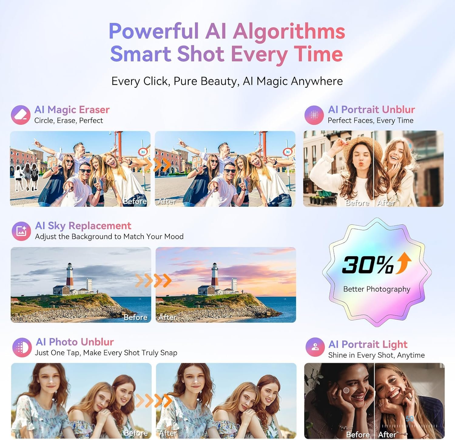 【5G Network & Dual SIM Support&AI Functions】The 5g phones unlocked offers an incredibly high speed connection Whether you are engaging in real time cloud gaming or conducting video conferences, allowing for a seamless network experience. The device also features a Dual SIM design, this enables you to use one SIM for personal calls and messages, and the other for business related contacts, conveniently separating personal and professional affairs and enhancing the usability. The 5g unlocked phone also support Smart AI Functions, such as AI Chat, AI Voice, AI Control, etc.