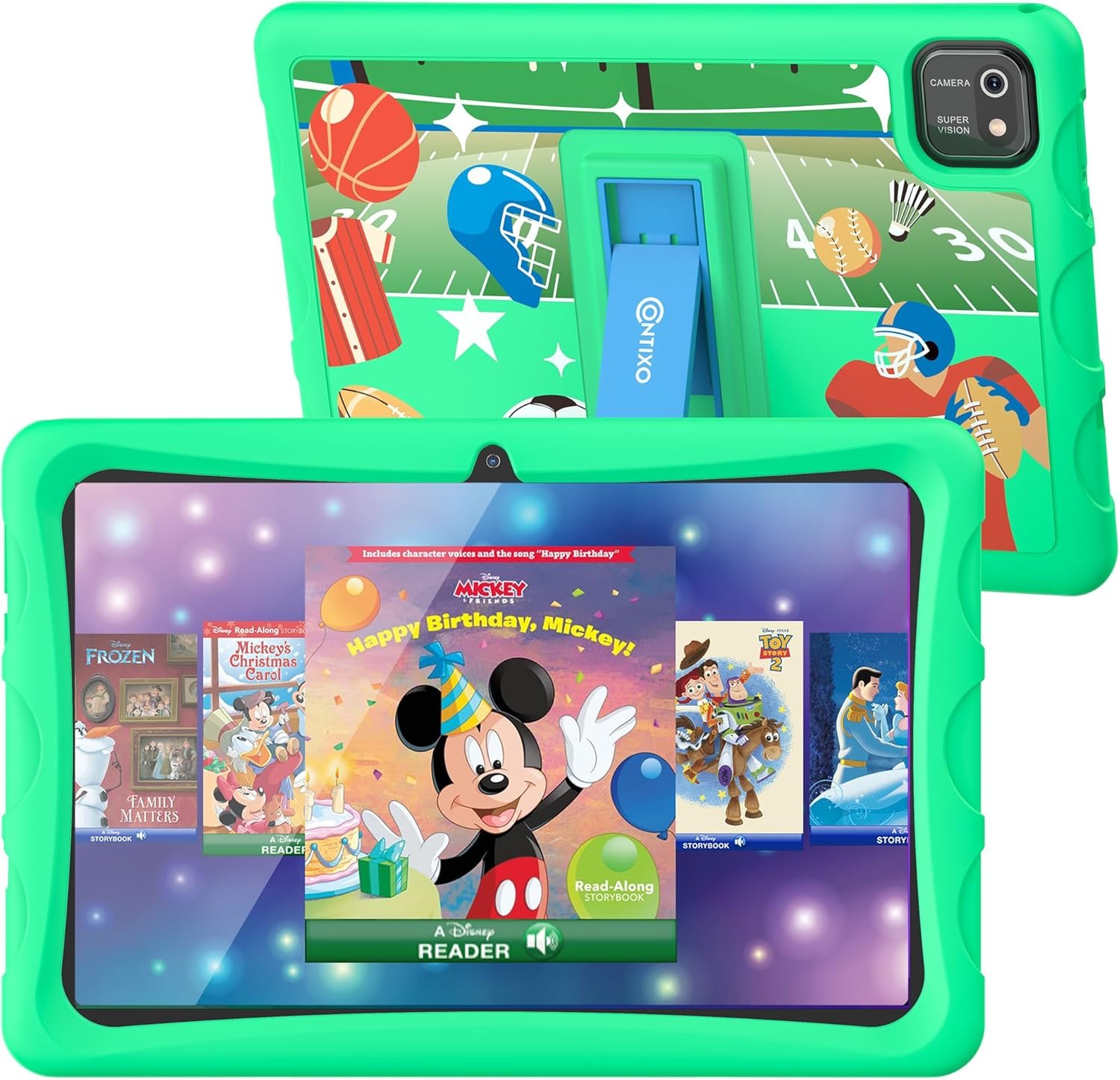 KID-PROOF CASE & DISNEY CARTOON STICKER – The silicone case is designed to prevent the kids tablet from damage during falls and collisions, with an adjustable stand for studying, watching, or playing. Includes 16 Disney stickers to personalize your tablet. A perfect gift for birthdays, Christmas, or New Year celebrations.