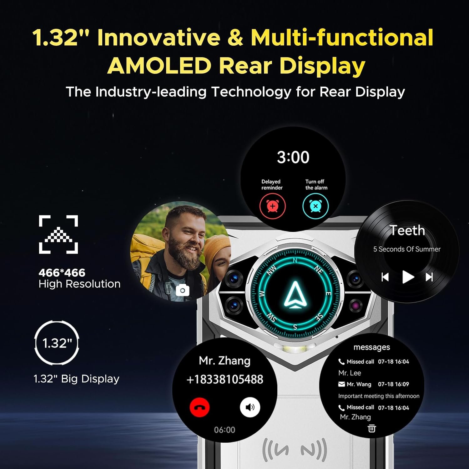 【𝟏.𝟑𝟐” 𝐀𝐌𝐎𝐋𝐄𝐃 𝐂𝐮𝐬𝐭𝐨𝐦𝐢𝐳𝐞𝐝 𝐑𝐞𝐚𝐫 𝐒𝐜𝐫𝐞𝐞𝐧】5G rugged smartphone S200 features an innovative 1.32” AMOLED rear display, offering customizable options like personalized wallpapers, text signatures, and watch face designs. Even when the main screen is off, you can easily check the date and time, notifications, battery status, control music, take calls, access weather and other secondary displays, and more from the rear screen. Perfect for outdoor adventures, S200 cellphone helps conserve power while keeping essential functions accessible, making your daily life and outdoor activities more convenient and tech-savvy.