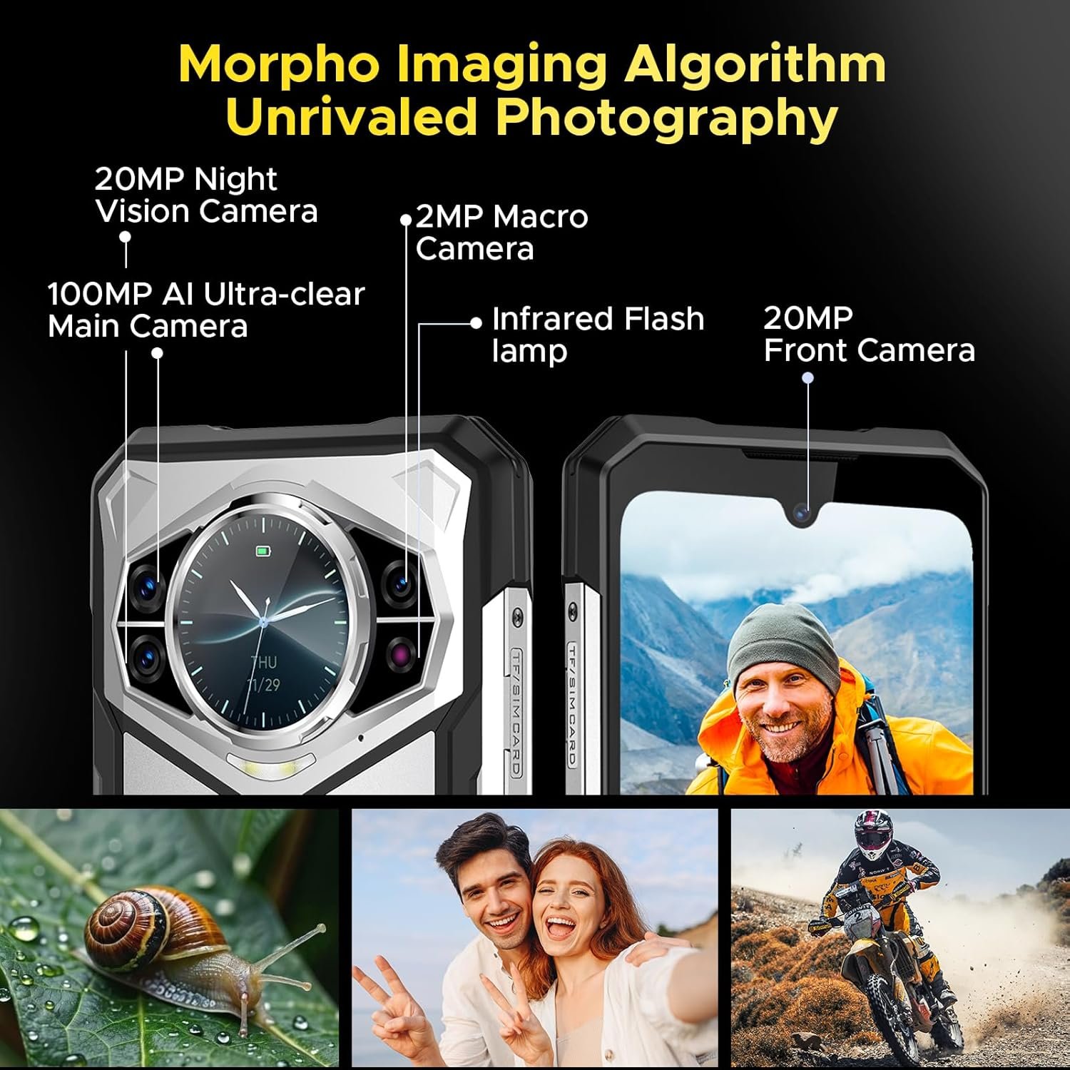 【𝟏𝟎𝟎𝐌𝐏 𝐀𝐈 𝐌𝐚𝐢𝐧 𝐂𝐚𝐦𝐞𝐫𝐚 +𝟐𝟎𝐌𝐏𝐍𝐢𝐠𝐡𝐭 𝐕𝐢𝐬𝐢𝐨𝐧+𝟐𝐌𝐏】DOOGEE 5g rugged smartphone is equipped with a versatile quad-camera setup: a 100MP AI main camera, 20MP night vision camera, 20MP front camera, and 2MP macro camera, offering endless possibilities for capturing moments. The 100MP AI camera delivers crystal-clear details, while advanced AI algorithms provide anti-shake stability. The dedicated night mode enhances low-light photography, making nighttime shots sharper and more vibrant, ensuring a superior photo experience in any setting.