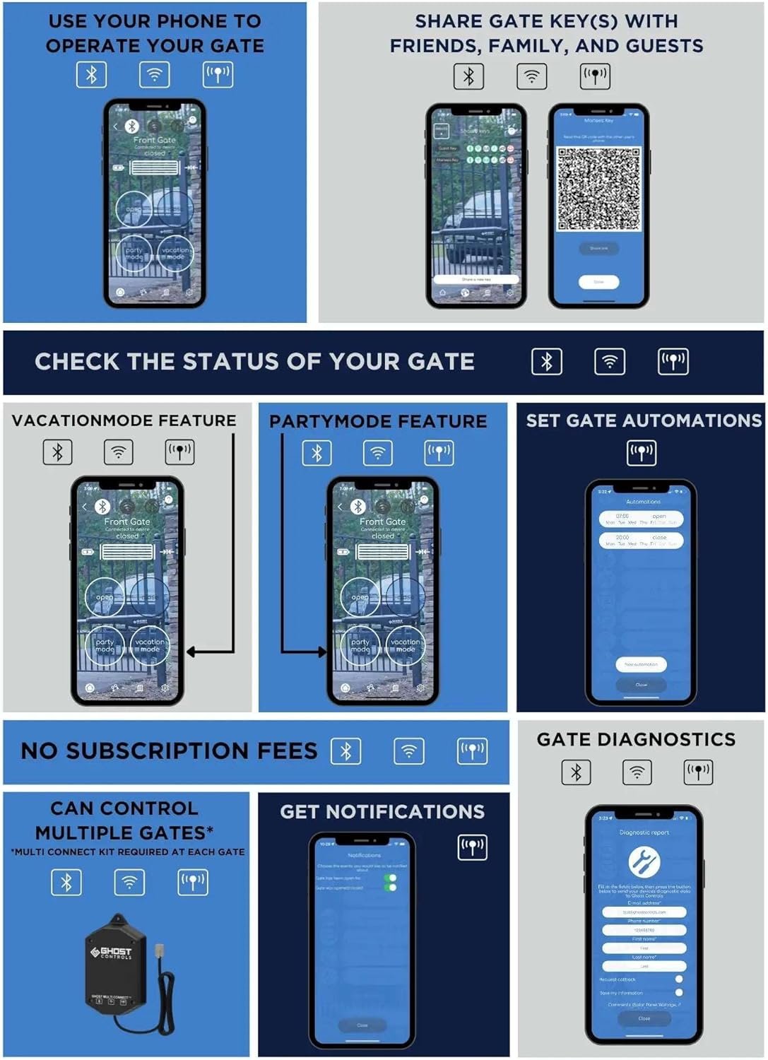Internet: Connect your MultiConnect to your Internet-connected Wi-Fi and control your gates remotely to include notifications, virtual status display, diagnostics, and scheduling automations.