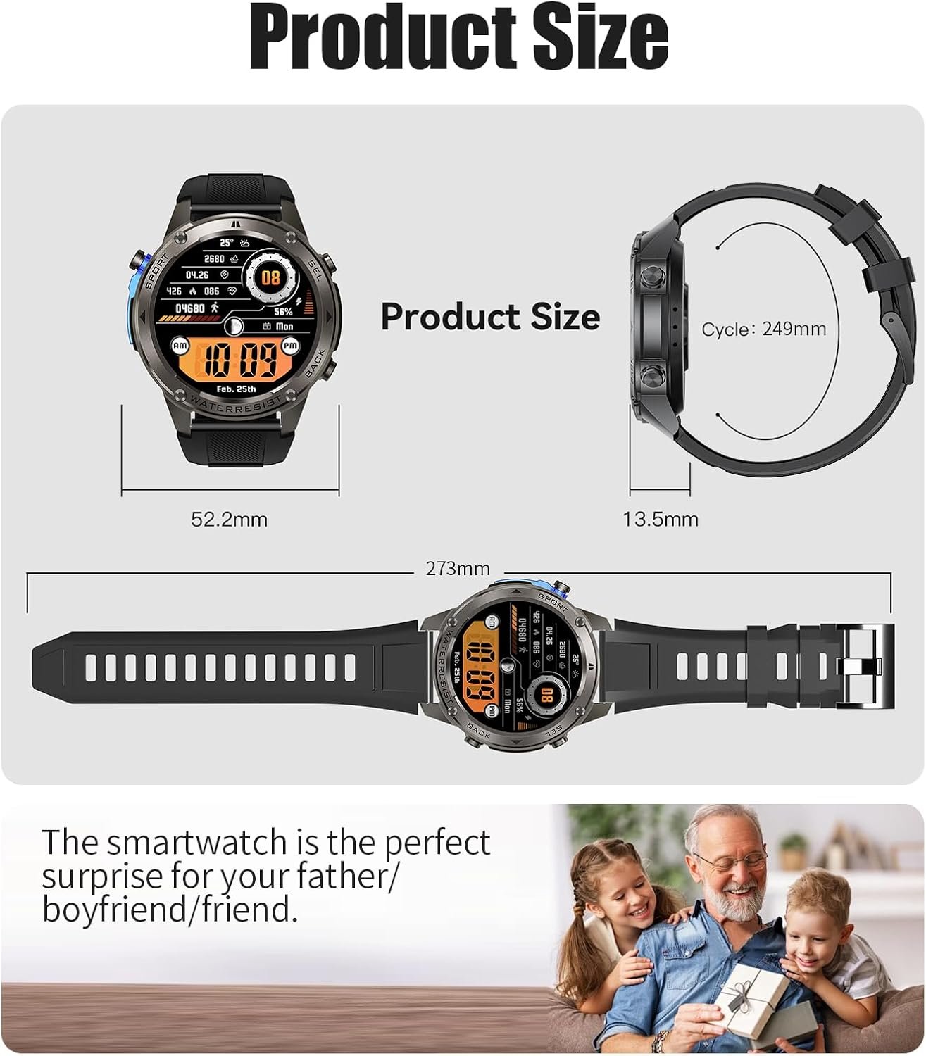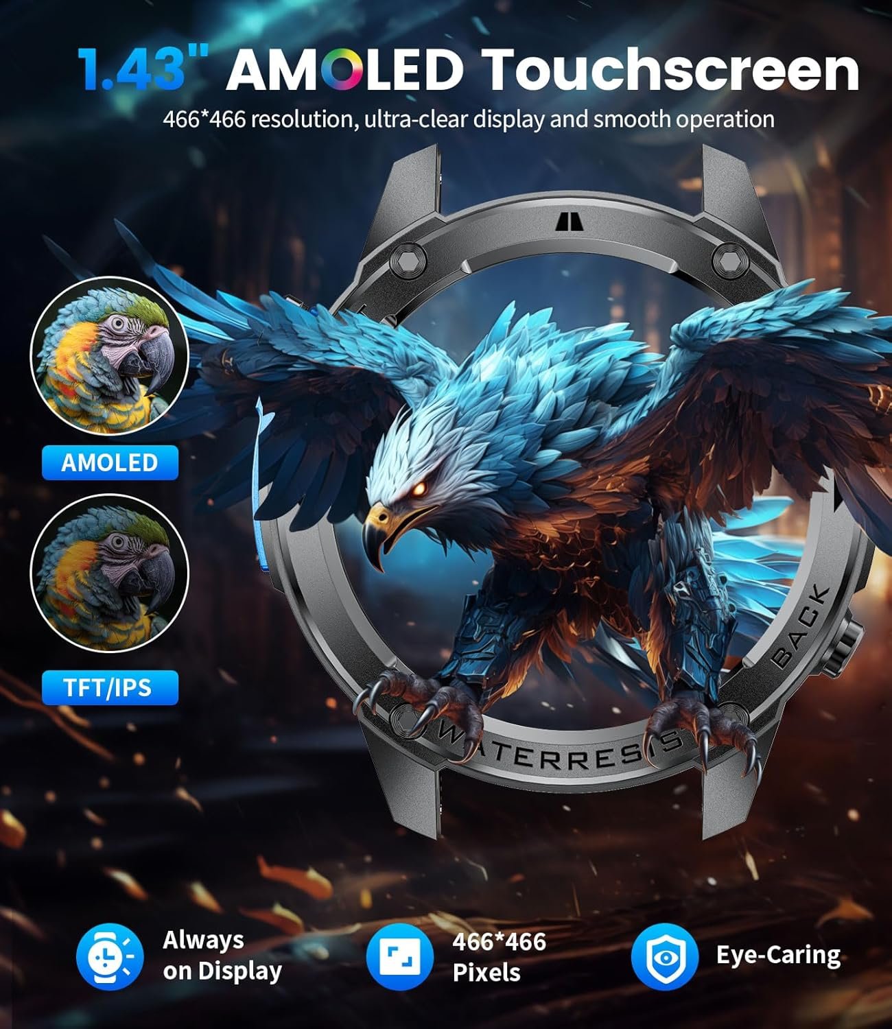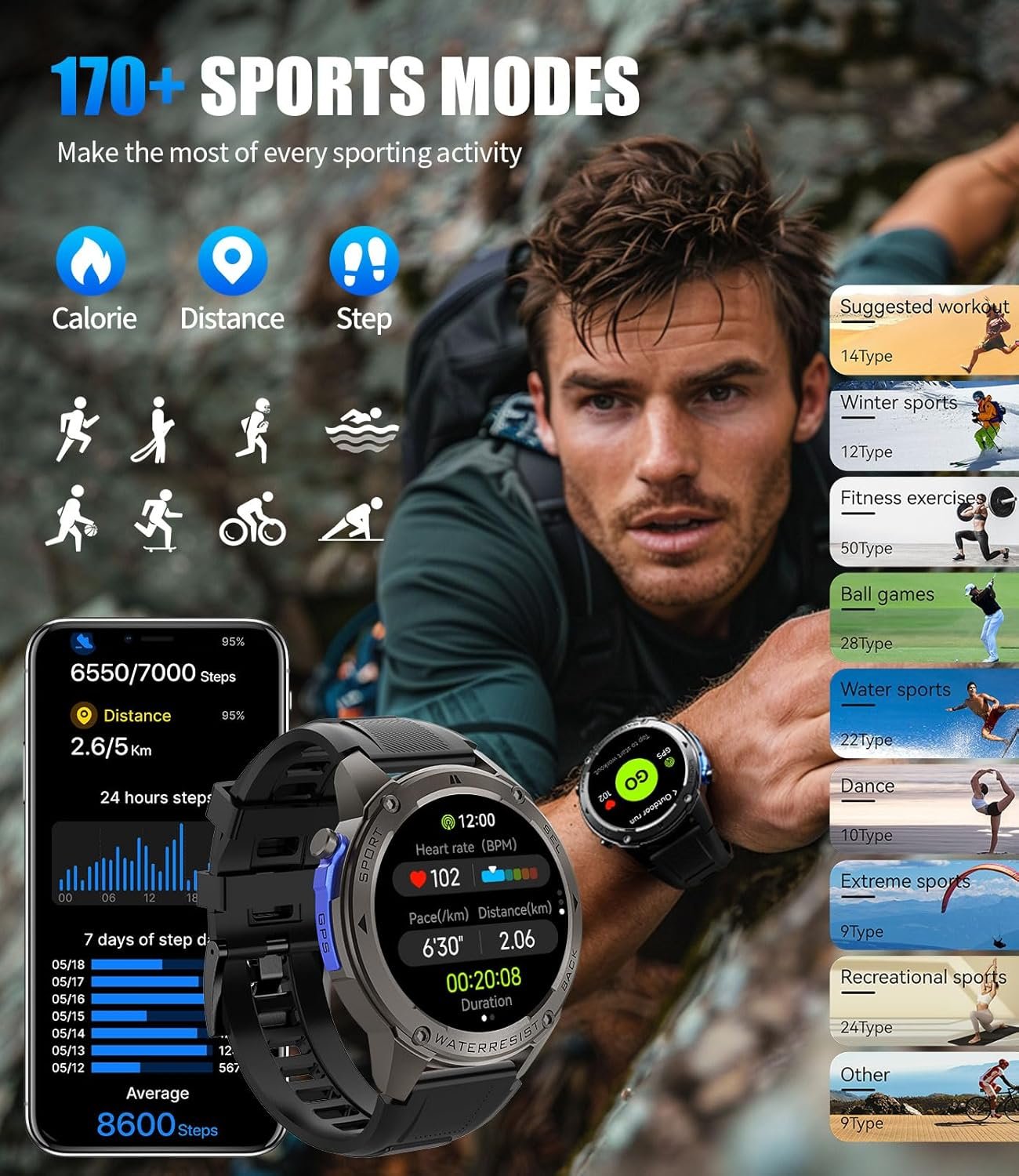 1.43″ AMOLED Rugged Military Smartwatch with GPS Compass Barometric Altitude,170+ Sport Modes Smart Watches for Android iPhones