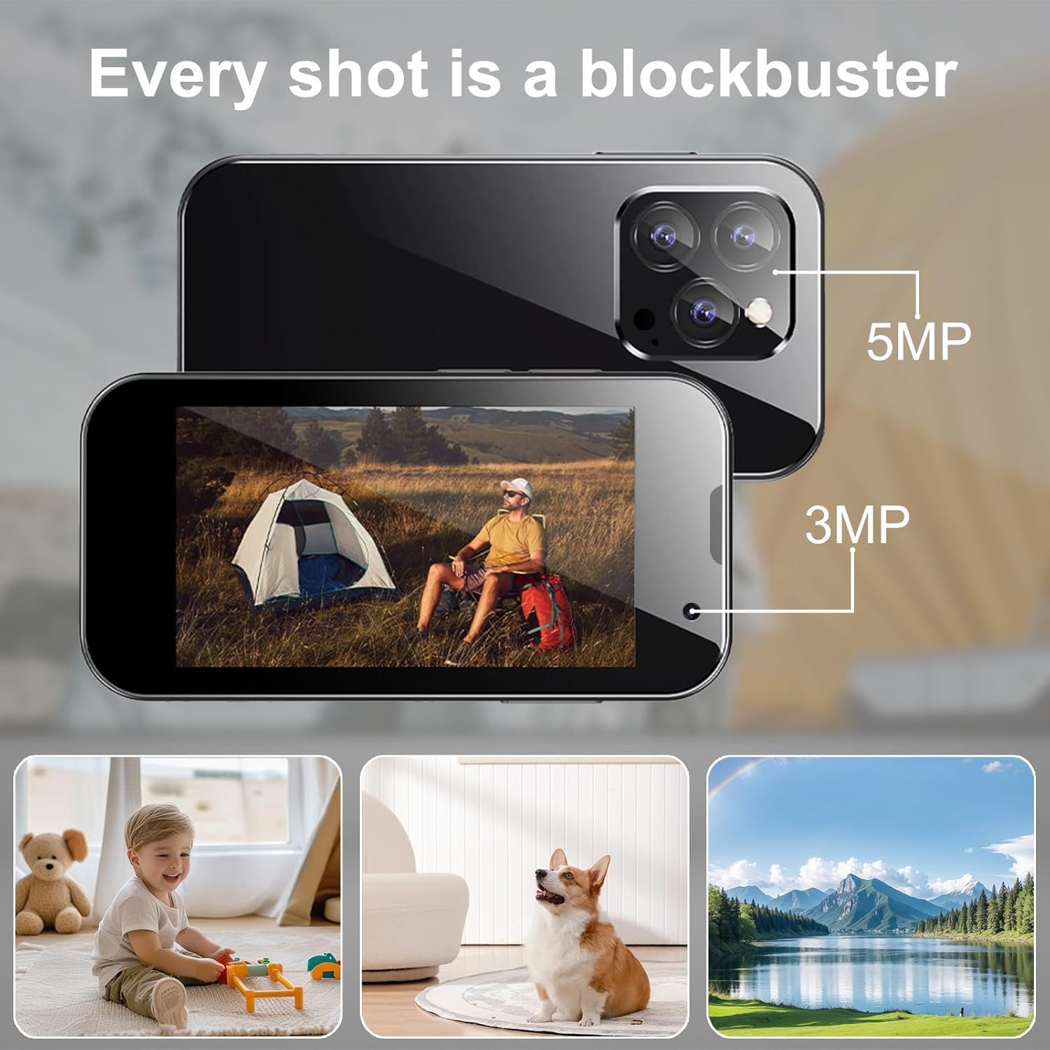 3. Dual Camera phone: The mini smartphone comes with a 3MP front camera and a 5MP rear camera, enabling you to take beautiful photos in a compact form factor. It has face ID for enhanced privacy protection. Moreover, with dual SIM and expandable storage (up to 256GB), you can insert either two SIM cards or one SIM along with one microSD card, providing more space for storing your data.