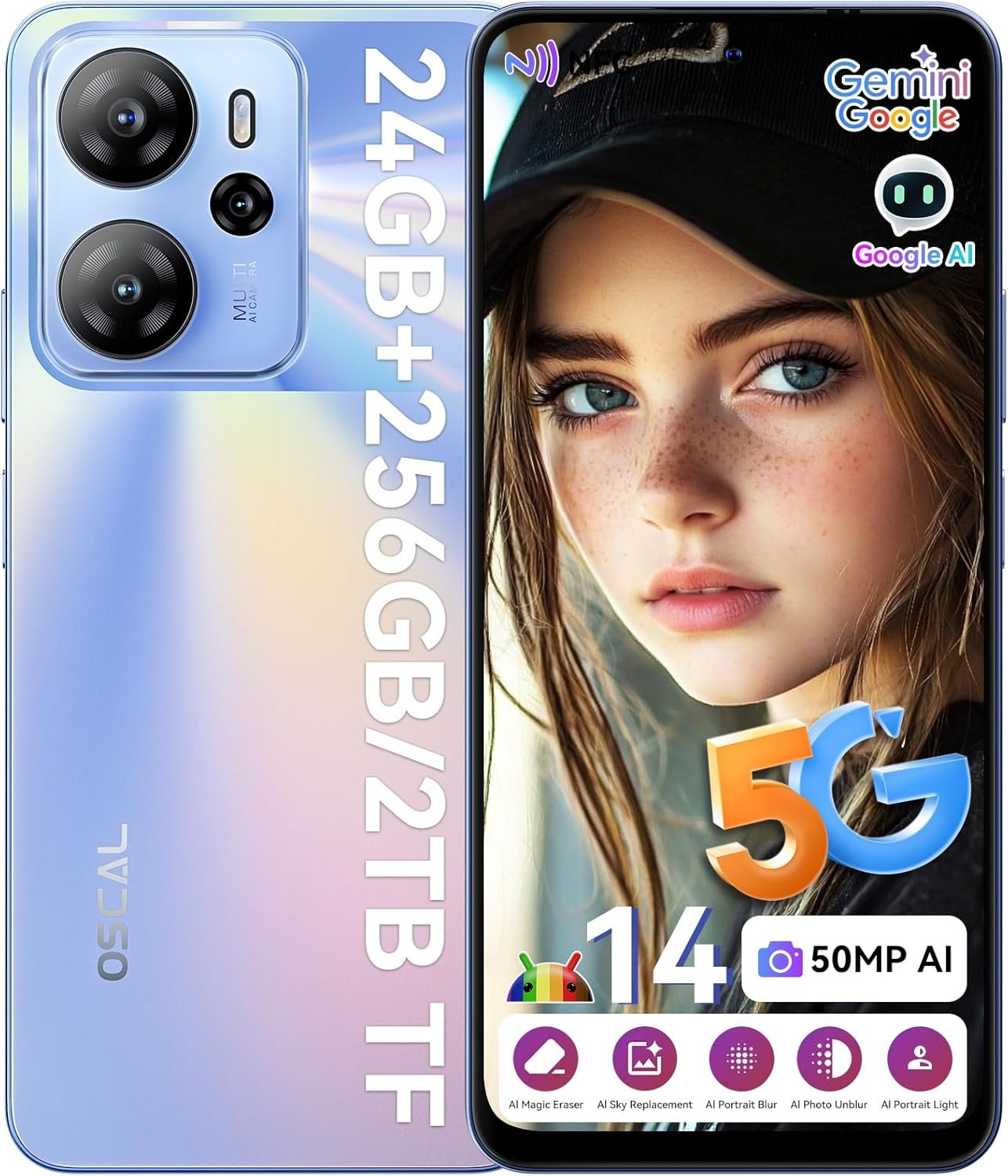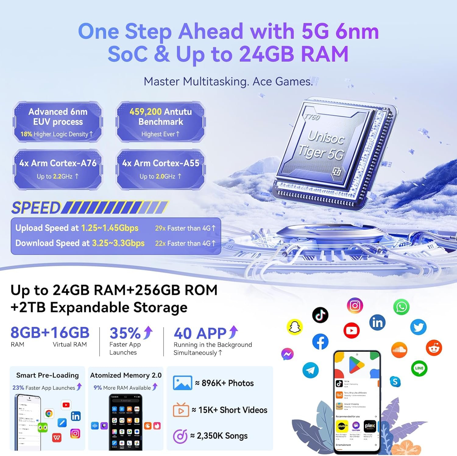 【The First 5G Phones Unlocked by OSCAL】TIGER 13 Unlocked Phone is equipped with 5G technology, that represents a significant leap in quality and performance. Offering lightning-fast connectivity for seamless browsing and gaming experiences. Featuring a remarkable 24GB(8+16) RAM and 256GB (Expand to 2TB) of internal storage, with octa-core processor, OSCAL TIGER 13 5G phones unlocked ensures exceptional speed and efficiency for multitasking and storing all your favorite content, meet all your mobile needs. Benchmarked with an impressive Antutu score of 457,000, this 5G smartphones is designed to provide a top-tier user experience.