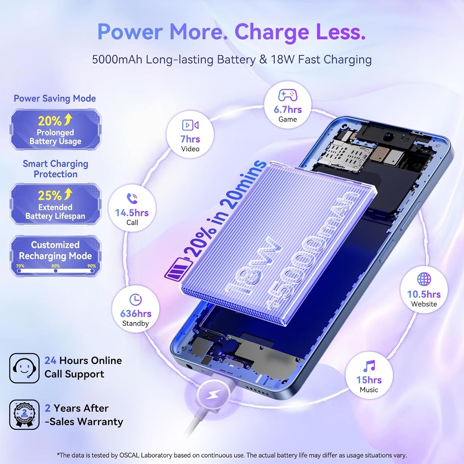 【Electricity is Always Online】Experience uninterrupted performance with OSCAL TIGER 13 Unlocked 5G Phone, equipped with a powerful 5000mAh battery,18W Rapid Charging.This robust battery ensures you stay connected with an incredible standby time of up to 636 hours. Enjoy your favorite music for up to 15 hours without worrying about recharging. OSCAL 5G mobile phones TIGER 13 also features 18W fast charging technology, allowing you to quickly get back to what you love. Our power-saving mode optimizes power consumption, extending your usage time. Plus, with smart charging protection, you can rest assured that your battery’s lifespan is maximized.