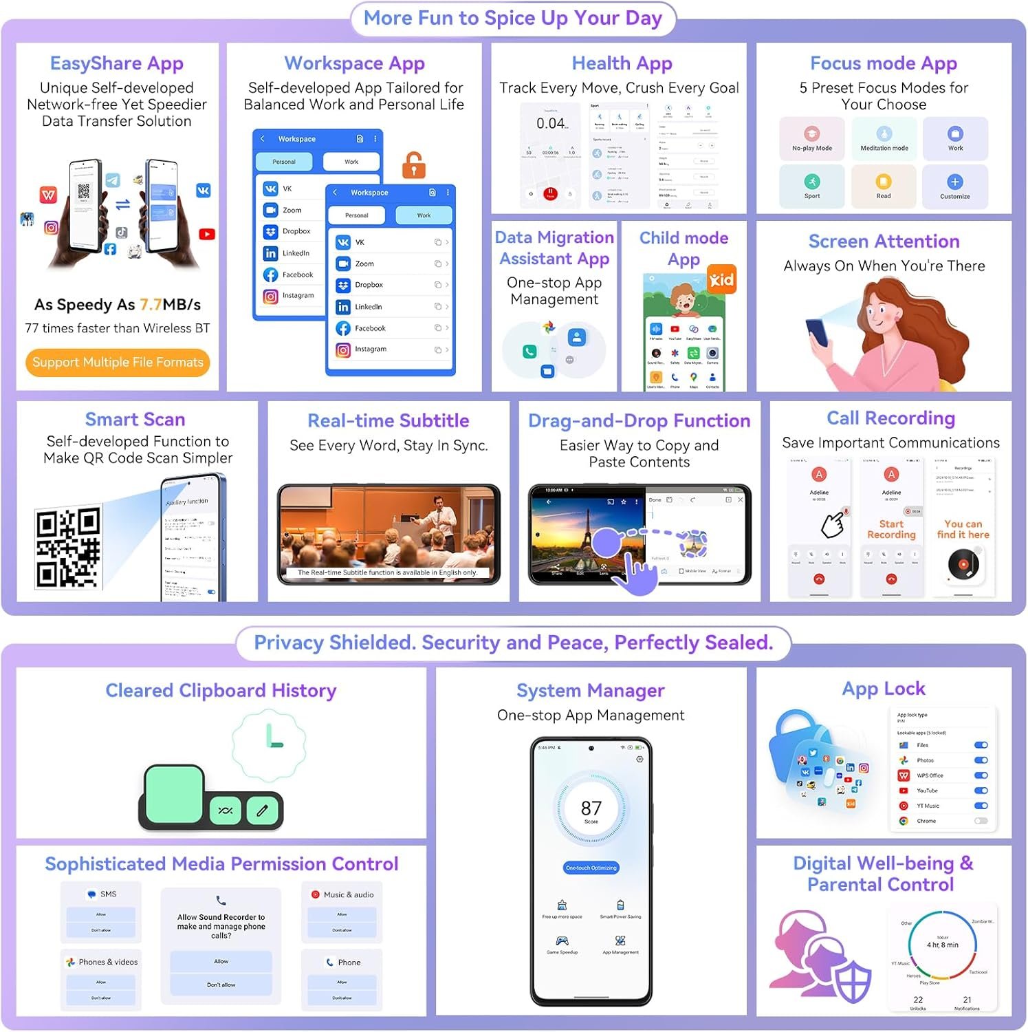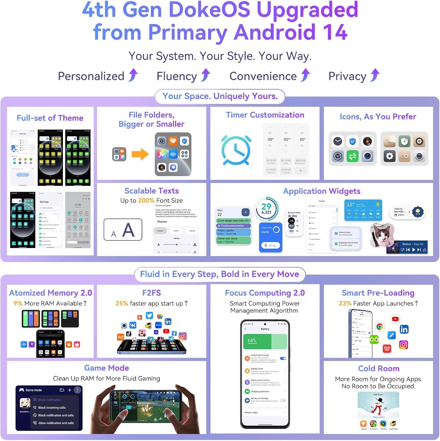 【Android 14 Phone+DokeOS 4.0】OSCAL TIGER 13 dual sim phones powered by Android 14 and our proprietary DokeOS 4.0 system. Android 14 offering improved battery management, enhanced security features, and a more intuitive user interface. This means you can enjoy a smoother experience with faster app launches and better overall performance. DokeOS 4.0 takes your experience even further with its innovative features. One standout advancement is the EasyShare app enables lightning-fast file transfers, so sharing photos, videos, and documents with friends and family is quicker and simpler than ever. A great mix of hardware and software for a mobile experience like no other!