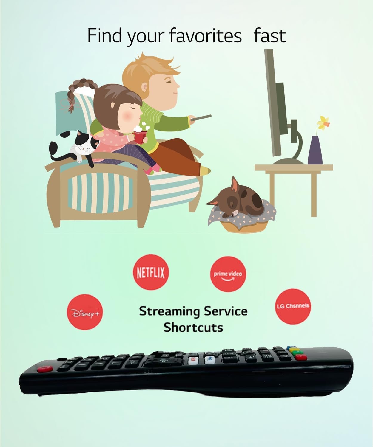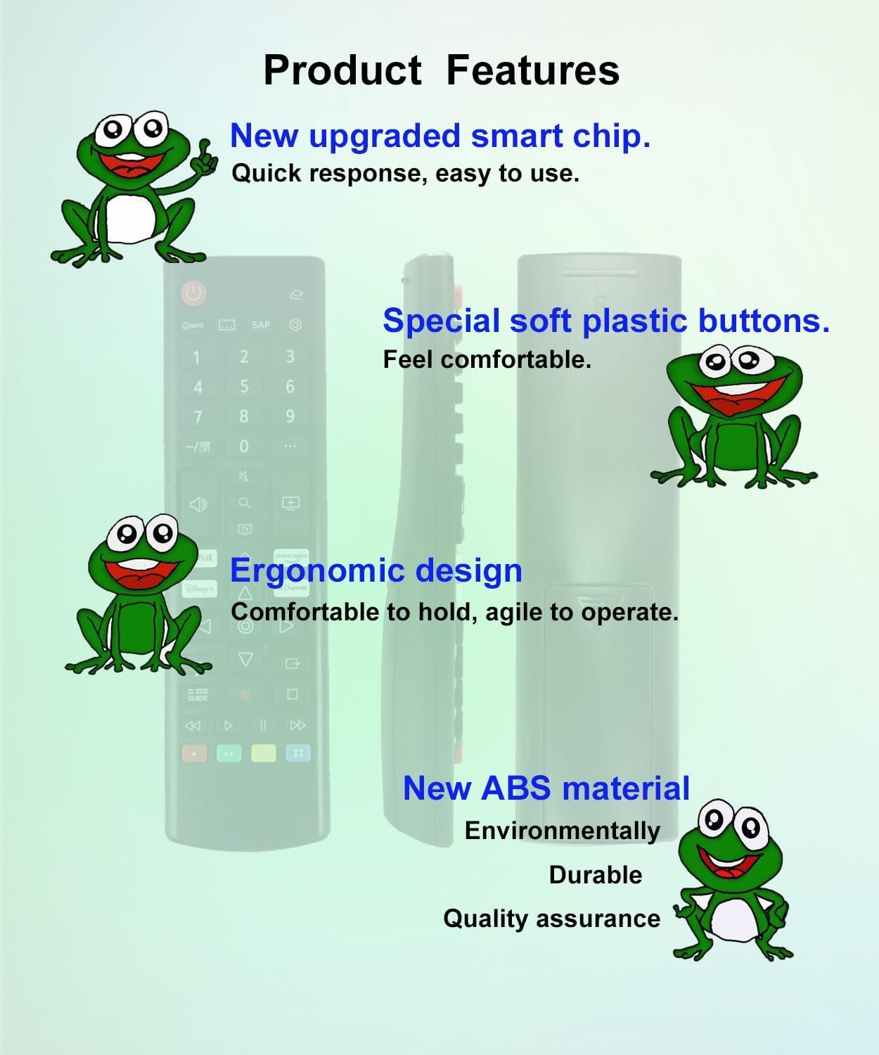 【Product Features】 Ergonomic design, comfortable to hold, agile to operate; Pre-Programmed, no program or set up required, just insert 2 *1.5V AAA batteries to get it work; New ABS material, environmentally durable; Includes shortcut keys Netflix Prime Video Disney+ LG Channels etc; Response quickly.