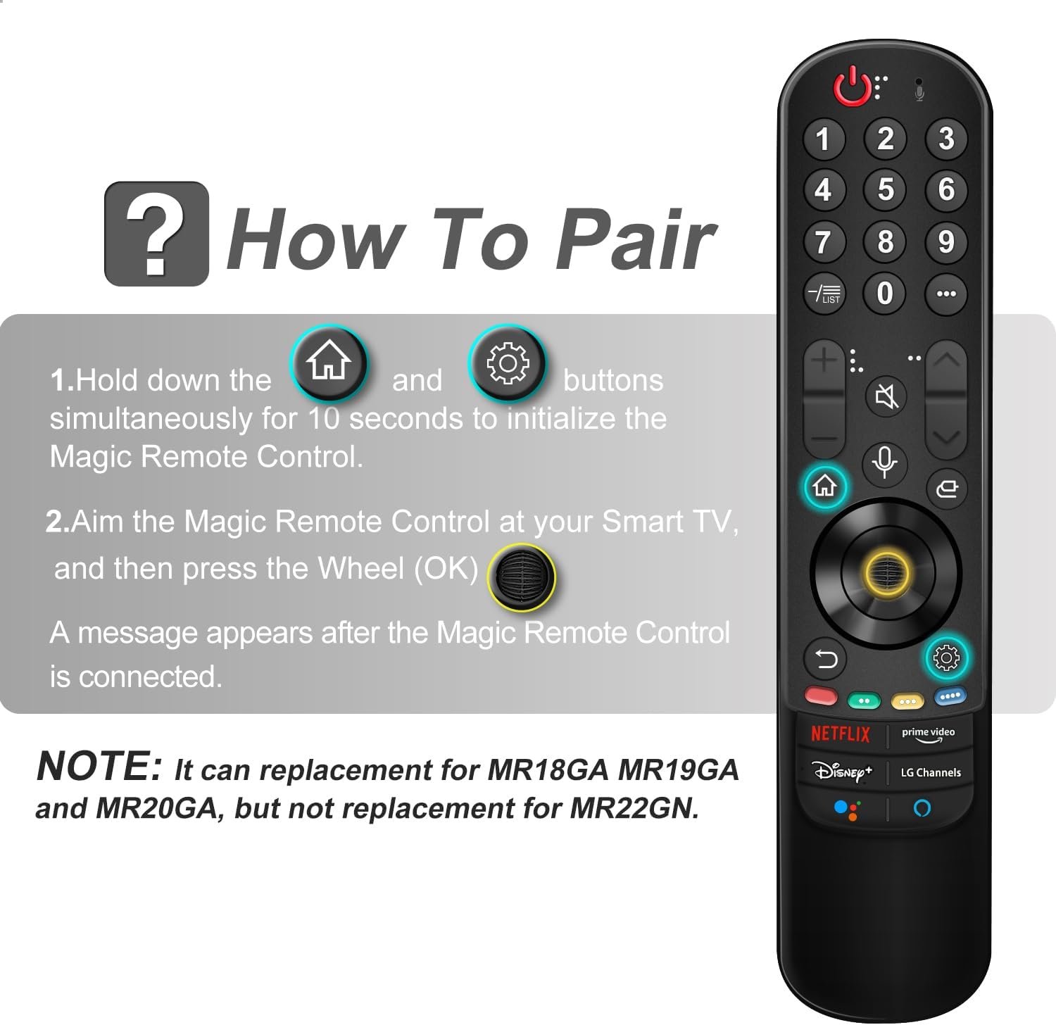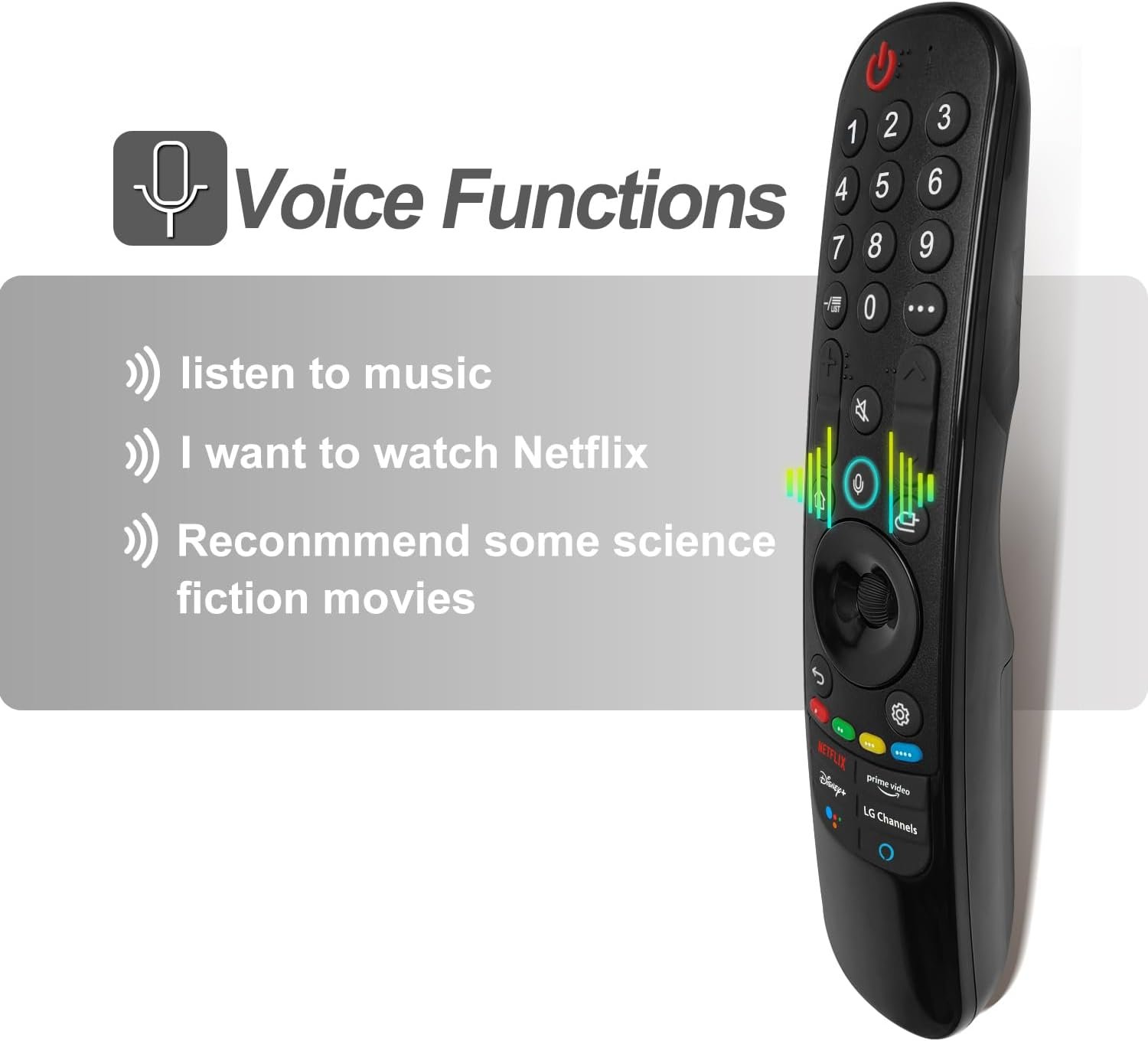 【Compatible TV models】 Replacement magic voice remote fit for 2022 LG smart TVs, including OLED Models: OLED Z2, G2, C2, B2, A2 series; QNED Models: QNED99, 90, 85, 80 series;NanoCell Models: NANO80, 75 series; UHD 4K Models: UQ90, UQ80, UQ75, UQ70 series