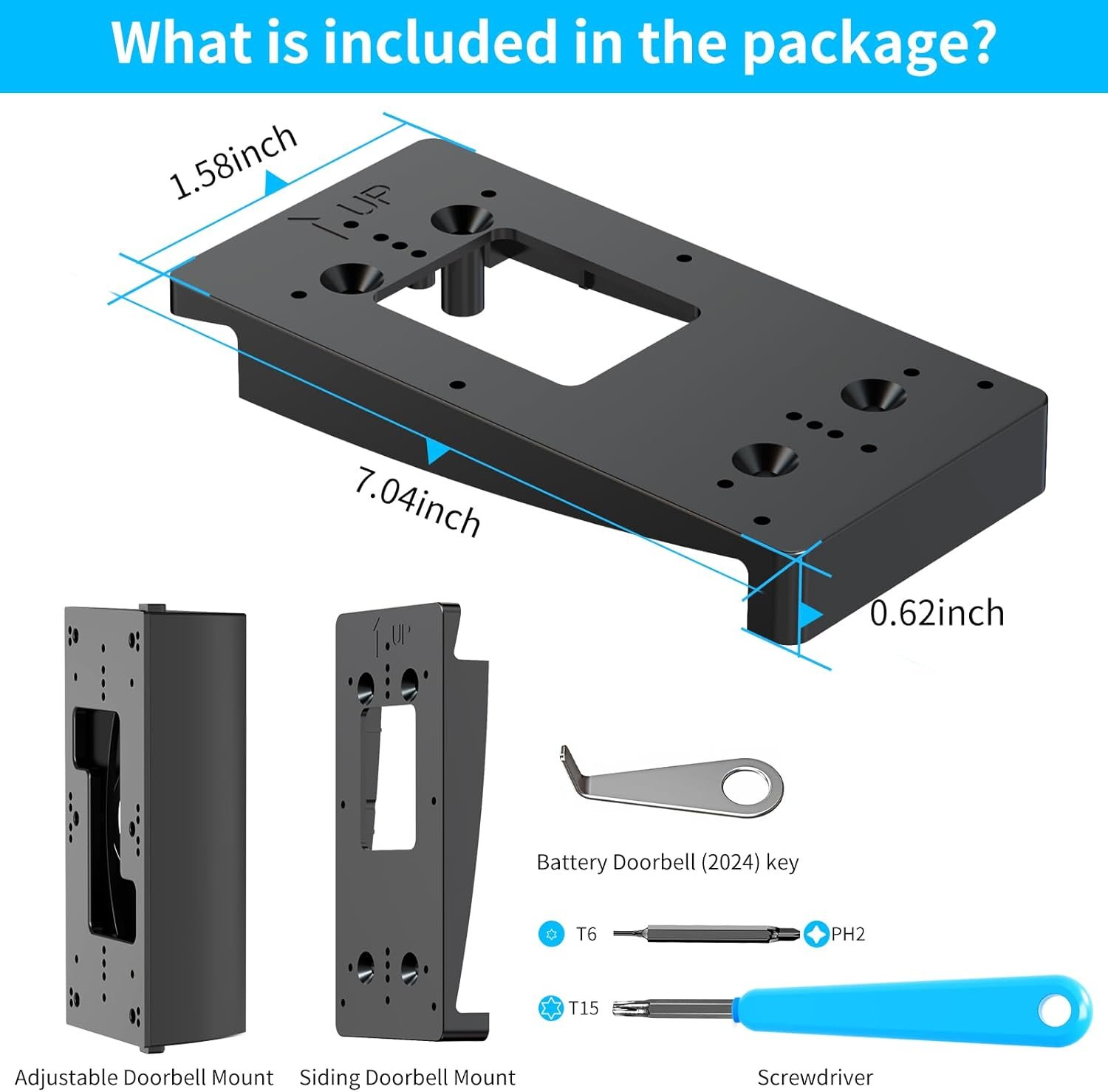 PACKAGE CONTENT: 1* vinyl siding doorbell bracket, 1* doorbell adjustable angle bracket, installation accessories and installation instructions. If you have any questions about our products, please feel free to contact us.