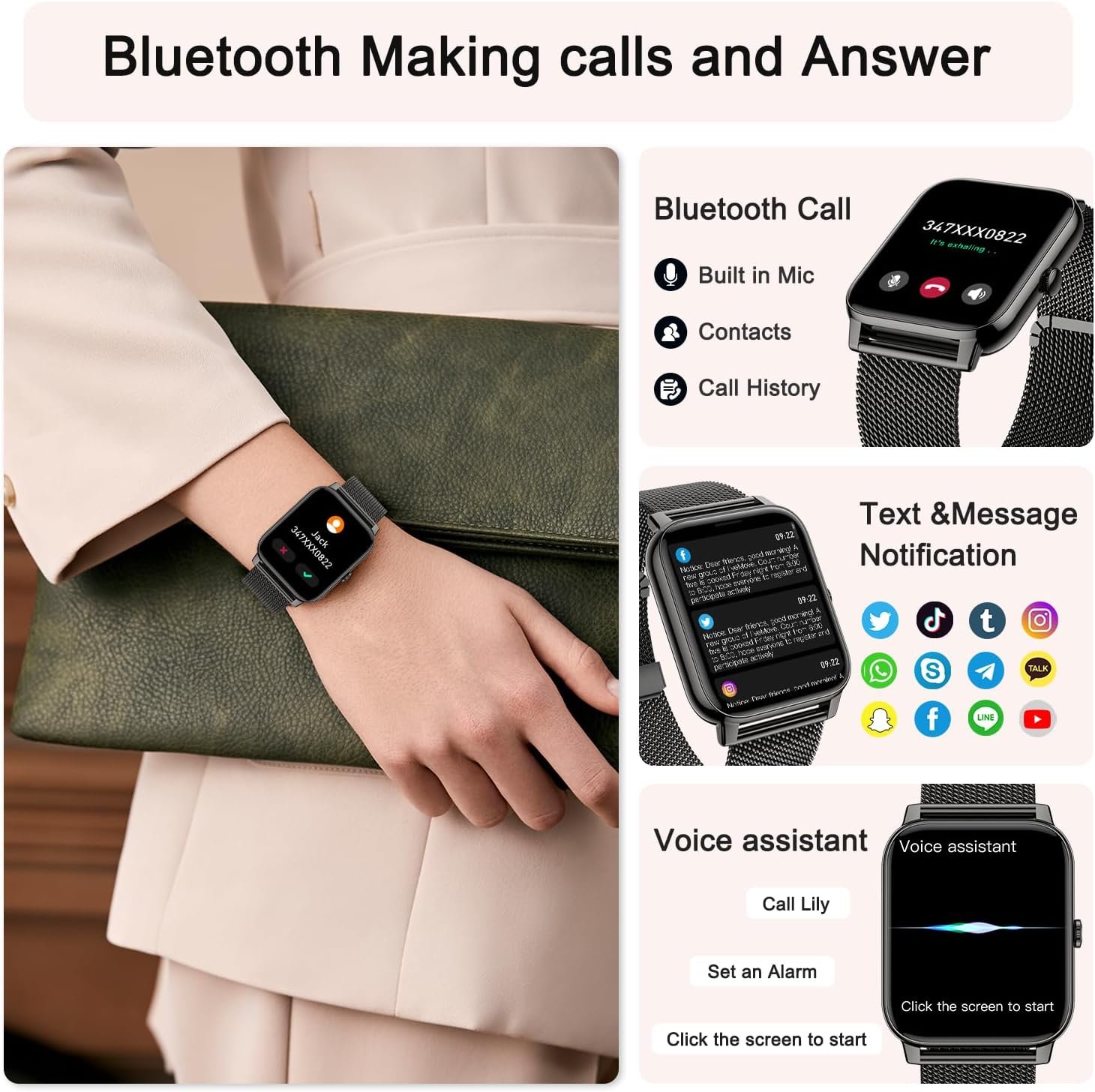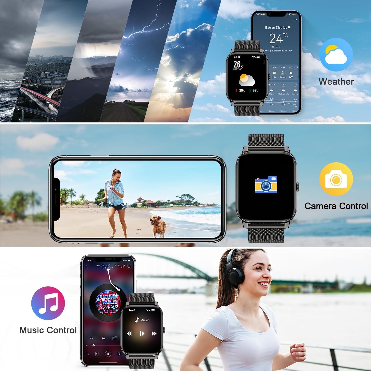 Large face watches for Men Women : Smart watches for men women adopts a larger screen design, and come with 2 watch bands of different colors. The bright frame and strap perfectly enhance the elegance of the overall outfit.Smart watch for android phones contains many dials readily available to choose from along.You can also DIY watch faces with your own photos.Smart watch for iphone compatible can be any photo,such as your family,pet,et