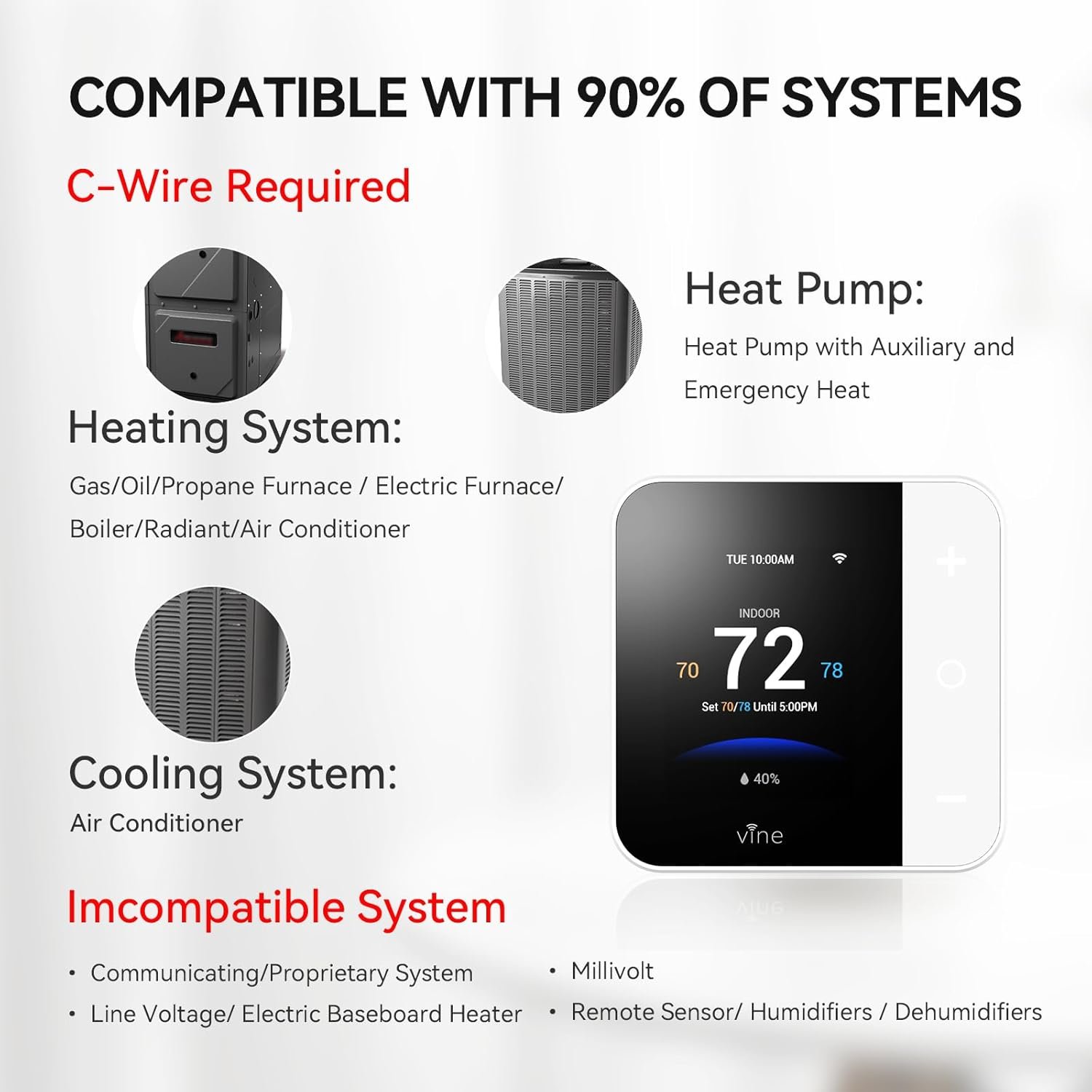【Wide Compatibility】This ac thermostats for home is compatible with 90% of system: Conventional (2H/2C); Heat Pump (4H/2C); Supports natural gas, electric, hot water, gas fireplaces (24 Volts), oil heat sources; heat pump, dual fuel. All system types require a common wire (C-Wire).